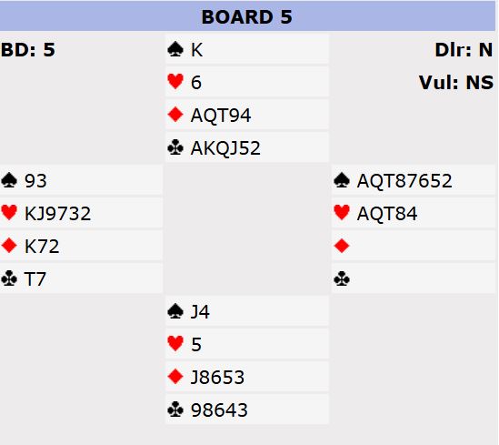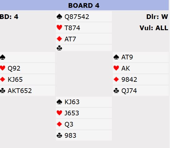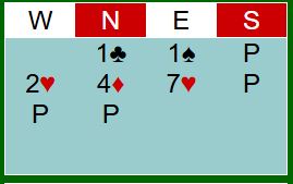 Men det skjedde ikke. Da Sophie hadde sagt 1 spar og syd pass kom vest med en overraskende meldingen for øst: 2 hjerter. Nord hoppet til 4 ruter, og da kom nok en overraskende melding fra Sophie: 7 hjerter!