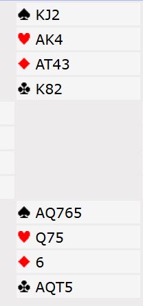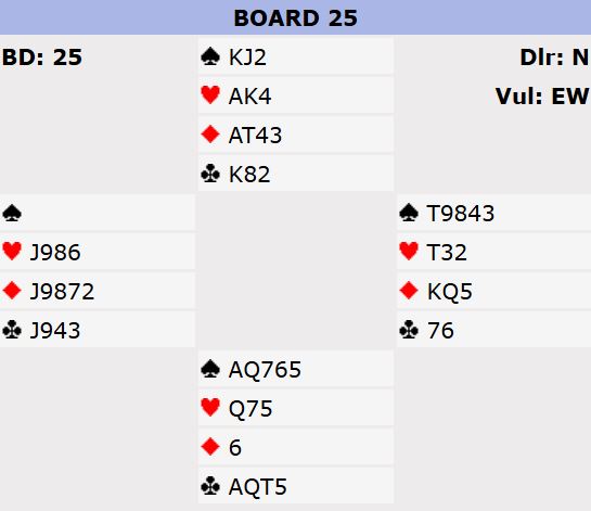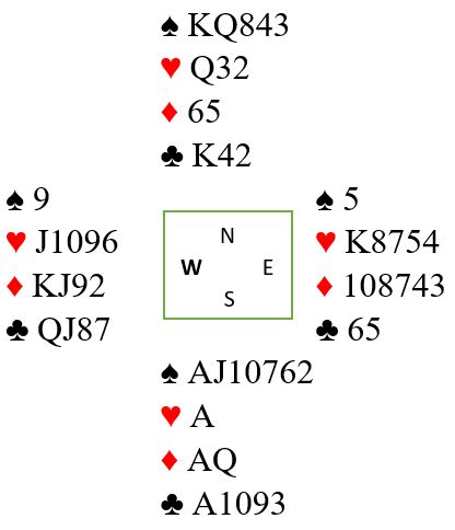 I kløverkontrakt på 4-4 tilpasning gir den fjerde og femte sparen avkast for hjertere hos nord. Men det må mer til, for eksempel er en slik kontrakt sårbart for 4-1 sits i trumf (kløver). Men syd ga ikke helt opp håpet om storeslem. Over svaret på 4NT sa syd 5NT, spørsmål om spesfikk konge, nedenfra om nord har mer enn en. Nord meldte 6 kløver.