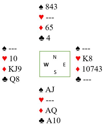 Vest vinner altså det kløverstikket og har så tre alternativer, men ingen av dem er bra for motspillerne. Han må enten avslutte med kløver til syds A-10 saks. Syds fjerde kløver gir så avkast for en ruter hos nord. Det hjelper selvsagt ikke vest å spille ruter unna kongen rett inn i syds saks. Og å spille hjerter til dobbel renons stjeles på den ene siden med ruteravkast fra den andre.