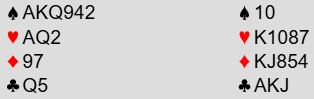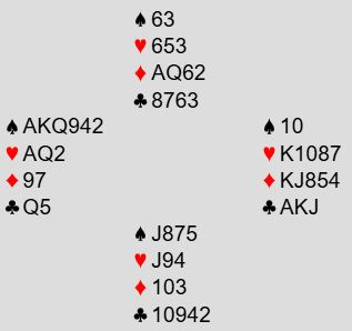 Hoppet til 3 spar var nok for Stian som hadde kontroller i alle sidefargene. Han gikk direkte i 4NT for å spørre om nøkkelkortene (Key Cards). Vest satt med tre nøkkelkort (spar A-K og hjerter A) og svaret 5 kløver viste 0 eller 3, men 0 kan det ikke være i denne settingen. Over 5 kløver sa øst 5 ruter som spurte om trumfdamen, og vest som satt med den avsluttet med 6 spar. Slik så hele spillet ut: