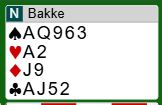 Bakke gikk for en nokså sikker utgang, mulig slem. Så han sa 2 spar over vests 1 spar, overmelding av motpartens farge. Det benekter lang ruter- eller hjerterfarge, og han har heller ikke firekorts hjerter siden han med det ville doblet negativt. Så 2 spar viser gode kort og kløverfarge, og de fleste bruker en sånn overmelding som minst invitt til utgang. Brogeland som ikke hadde vist kløverfarge med åpningen 1 kløver likte å høre at nord satt med kløverfarge, for da ble minimumshånden sterkere enn først antatt. Han sa 3 spar - antagelig avtalt som singelton. Bakke kunne liksom ikke gjøre noe annet enn å si 3NT over det, men Brogeland likte tanken på kløverkontrakt så godt at han tok ut i 4 kløver. Det fulgte noen cuebids før de havnet i 6 kløver som er en glimrende slem. Vest fant beste utspill, ruter. Men to runder kløver viste at det ikke var trumftaper. En ruter forsvant fra nord på hjerteren, og det var ingen problemer med å vinne alle tretten stikkene, N/S +1390. Om kløver dame hadde sittet tredje ville det selv etter det beste utspillet sett fra forsvarets side blitt vunnet slem om den med tre kløvere følger minst to ganger hjerter slik at spillefører rekker å bli kvitt en ruter fra nord.