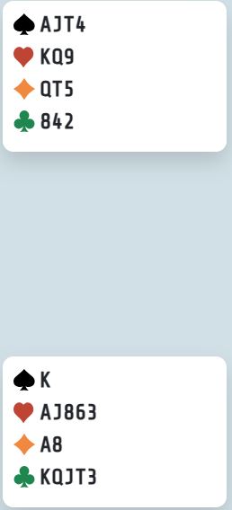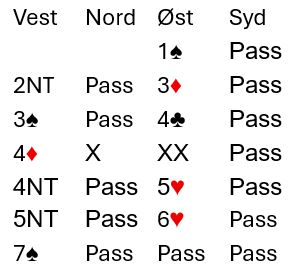 Bør det meldes slem? Ja. Det er en veldig bra lilleslem i hjerter. Om det kommer ruter ut og motspillerne får satt opp ruterstikk kan man ta for spar konge, trumfe ut og kaste syds lille ruter på spar ess, så deretter avgis stikk kun til kløver ess. De eneste problemene kan være at trumfen sitter 5-0, eller at kløveren sitter 4-1 og de kan få tatt for esset og gitt makkeren kløverstjeling. Så 6 hjerter har svært gode sjanser.