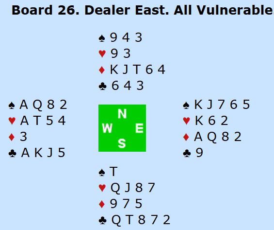 Stokkeland-Johnsen fant frem til 6 hjerter etter en lang meldeserie som startet med sterk kunstig kløveråpning av syd. Kanskje burde vest vært med og forstyrret mot sterk kunstig 1 kløver? Eller øst? Det var de ikke, og det norske paret hadde god styring på meldingsforløpet; resultat: 6 hjerter med tolv stikk og NORWEGIANS +1430.