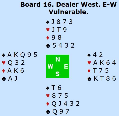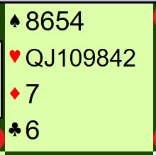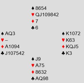 Vest var spillefører i 6NT og fikk hjerter knekt ut ved de fleste bordene. Det er seks sikre stikk i majorfargene, to ruterstikk og to kløverstikk = 10. Men flere muligheter for ekstra stikk. Om hjerteren sitter 3-3 er det elleve stikk, og om sparen også sitter fordelt 3-3 eller en av dem har J-10 dobbel i spar er det tretten enkle. Men hva om ingen av de fargene gir ekstra stikk?