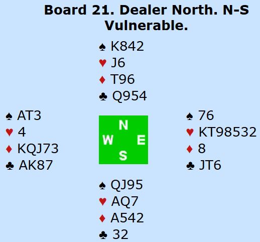 Ved en god del bord åpnet nord med 1 kløver, syd meldte hjerter (eller ruter) og nord sa 1NT, 12 (11)-14 før syd avsluttet meldingene med 3NT. Noen steder ble syd spillefører i 3NT for eksempel etter "kløverføringer".