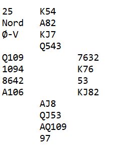 Det kan vel være nord ville gått på ruteren (som øst ser på bordet) uten ruter konge. Og har nord ruter konge blir det veldig lite igjen i kløver. Men nord kan nok ha for eksempel ruter knekt tredje og vente med den finessen og heller sette opp hjerteren først, men mange ville sikkert ha tatt ruterfinessen med det samme om de ikke har ruterkongen selv. Og har nord ruterkongen må kløverskift være en bra sjanse.
