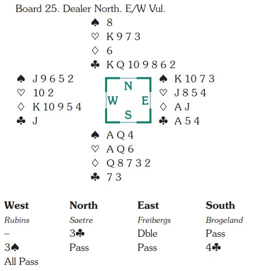 Vinnerlaget stampet i 5 ruter doblet som Ø/V. Der ble det to tapere i hver av fargene hjerter, ruter og kløver, -1100. Godt scorel mot slem, men tapt spill om lagkameratene ikke er i slem. Det var de ikke. Så vinnerlaget tapte dette spillet med 9 IMP, men det tålte de altså siden de vant turneringen med mer enn 5VP margin til nr. 2.