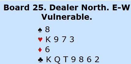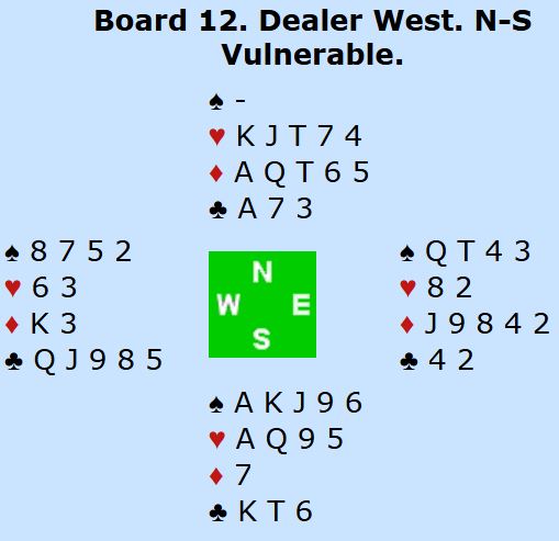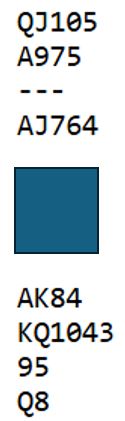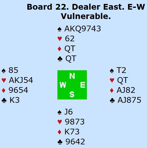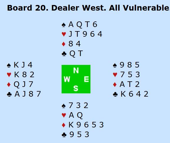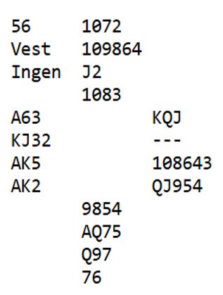 Etter pass fra øst åpner syd med 1 hjerter. Vest gikk nok innpå med 2 ruter ved mange bord. Da har nord til 4 ruter - Splinter. Men så blir det ikke bare å melde i fred, for øst våkner og melder 5 ruter. Hvordan det går videre om det er starten på meldingsforløpet er ikke godt å si. Det spørs hvor optimistisk nord er. På Hamar var litt over halvparten av N/S-parene i 6 hjerter.