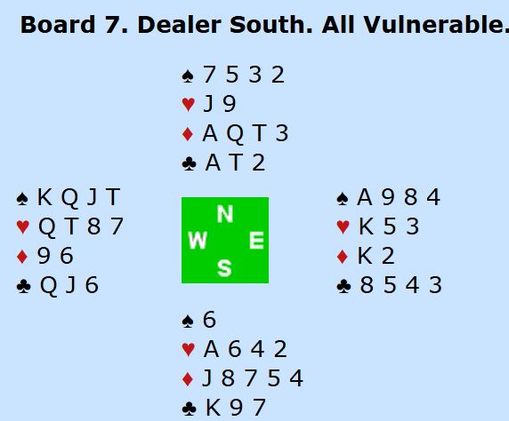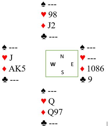 Dette er en kompakt lilleslem, best i hjerterkontrakt selv om sparkontrakt er ok det og. Trumffargen (hjerter) er 100% safe om det spilles kongen eller damen først. Hvis hjerteren sitter 3-1 eller 2-2 spiller det ingen rolle hvilken honnør som spilles først, men om det sitter 4-0 vil honnør fra syd gjøre at sitsen oppdages, og om det er 4-0 sits kan finesse tas gjennom den som har fire. Det blir greit tretten stikk om vest har kløver konge.