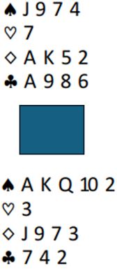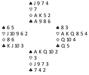 Nord dobler opplysende om vest åpner med 1 hjerter, og øst viser sin hånd med en melding som i parets system viser noe slikt som dette (enten vises mixed raise som er 6-9 med firekorts trumf, eller om man oppvurderer vises kanskje invitt+ med firekorts trumf). Syd bør være med til 3 spar, og da melder vest igjen. Det som kanskje best fungerer for at øst skal kunne vurdere godt er om han sier 4 ruter for å vise tofarget hånd. I slike meldingsforløp er det bra å få funnet ut om det er dobbeltilpasning (tilpasning i to farger), for da er det ofte mange stikk i begge retningene. Øst har en fin ruter dame og med så fin trumf bør han være med over N/S sin 4 spar hvis vest fikk vist frem ruterfargen. Men å si 4 hjerter med vests kort er greit det og (skjuler kortene bedre), men så idet de er med til 4 spar må vest vurdere om han skal gå på en gang til med sin litt uvanlige hånd for et slikt meldingsforløp.