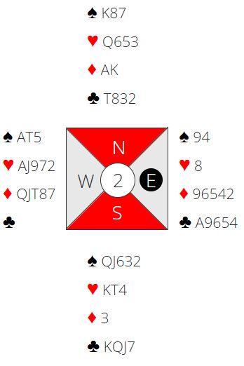 Om en ser bare på N/S sine kort er det bare tre tapere. Men 4 spar kan betes og det kan sogar bli flere bet om motspillet sitter. Selv med ruter ut bør det bli det minst en bet. Spillefører går på trumfen, men da kan vest skifte til hjerter ess og mer hjerter. Øst trumfer og spiller kløver ess og kløver til trumf hos vest – to bet. Om vest skulle finne på å spille ut hjerter ess kan forsvaret få full uttelling. To stjelinger hos øst med hjerterspill hver gang vest er inne, to stjelinger hos vest med kløverspilling fra øst samt tre ess = syv motspillstikk! Men selv med fire mulige bet i 4 spar pga. den spesielle sitsen er det helt naturlig å være med til 5 ruter som Ø/V.