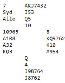 På hjerter 7 blir syd skviset i ruter og kløver – tolv stikk og vunnet slem i et spill hvor ingen Ø/V-par meldte og vant slem. To par til var i 6 hjerter. og begge gikk bet. Men de to andre som gikk bet gjorde det nok på en mer normal måte. For om nord melder, kanskje hopper innpå med sin syvkorts sparfarge vil spillefører være redd for overstjeling i andre stikk og derfor antagelig stjele høyt og ende opp med en trumftaper til nord!