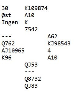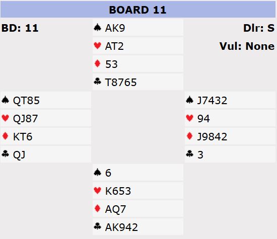 Noen få par var i slem mens resten stoppet i utgang. Kun to N/S-par (av ca. 40) vant 6 kløver, kanskje etter hjerter dame i utspill som gjør det enklere. For kommer det utspillet spilles simpelthen på at utspillet er fra Q-J, dvs. en vinner med esset og tar senere finessen med tieren.