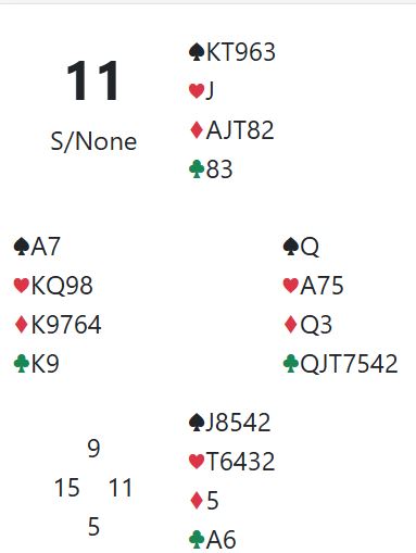 For å være ærlig, etter starten vi beskrev med "suit set" 3 spar fra åpneren i andre melderunde bør vel syd innse at 6NT bør bli sluttkontrakten uansett om vest dobler eller ikke?