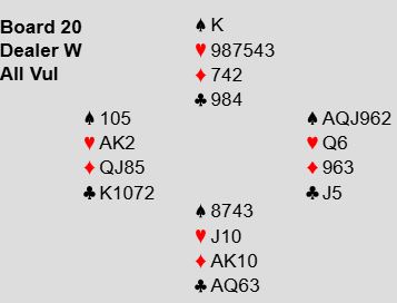Ved det andre bordet hvor Brogeland-Bakke spilte som N/S meldte øst forsiktigere og havnet i 3 spar etter en utgangsinvitt. Det ble for pessimistisk slik det satt: