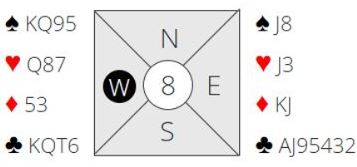 //At det faktisk står tretten stikk i ruterkontrakt bør ikke N/S bekymre seg særlig mye over om de kommer seg i 4 hjerter som i så fall vil gi en veldig god score. De blir neppe mange N/S-par som kommer i utgang med disse kortene.//
