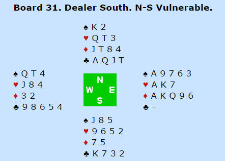 Jeg har vært med på noen diskusjoner med bl.a. Hoftaniska og landslagssjef Wennerød om begrepet momentum i bridgesammenheng. Er det i de hele tatt noe reelt som påvirker begivenhetenes gang? Slik jeg forstod landslagssjefen er det bare tull. Andre, og spesielt spillere som har vært i mange kampsituasjoner i store mesterskap føler imidlertid det er noe med det der "momentum" som ikke kan forklares. Det har kanskje mest med psykolog og selvtillit å gjøre. Hvis mån får et voldsomt gave-spill kommer det som regel flere gode spill i kjølvannet av det, og motsatt, når ting går galt kan det føles som om det er det samme hva man gjør i fortsettelsen, alt går galt. Selvsagt er det ingen rasjonell forklaring på dette, og Wennerød har nok rett i at det først og fremst handler om å spille ett spill av gangen.Likevel, jeg håper på et positivt momentum for alle de tre norske lagene utover denne uken. La oss gjerne få noen spill av det jeg nå skal fortelle, og aller helst tidlig i kampene. Spillet er fra seniorenes kamp mot Polen, og det kom (dessverre) i det nest siste spillet. At det ble fulgt opp med et stort norsk gevinstspill i det siste spillet beviser vel ingen ting med hensyn til momentum, men...